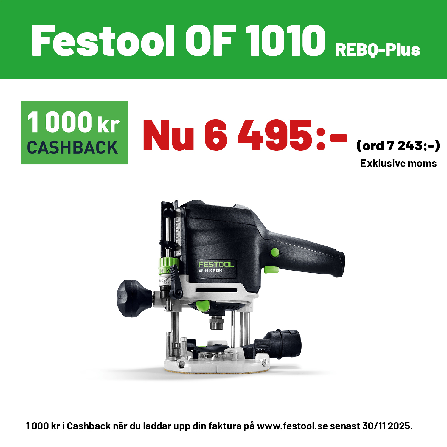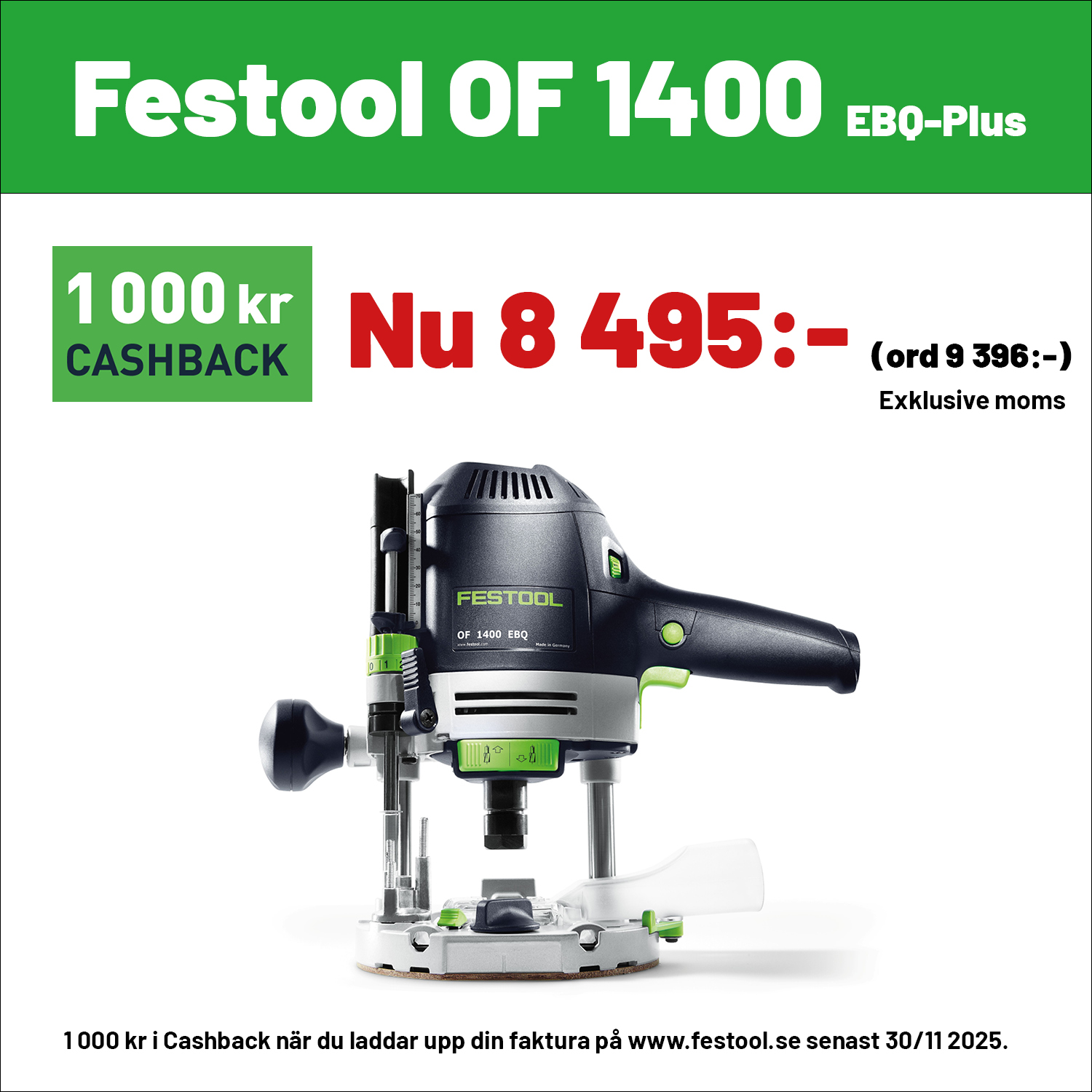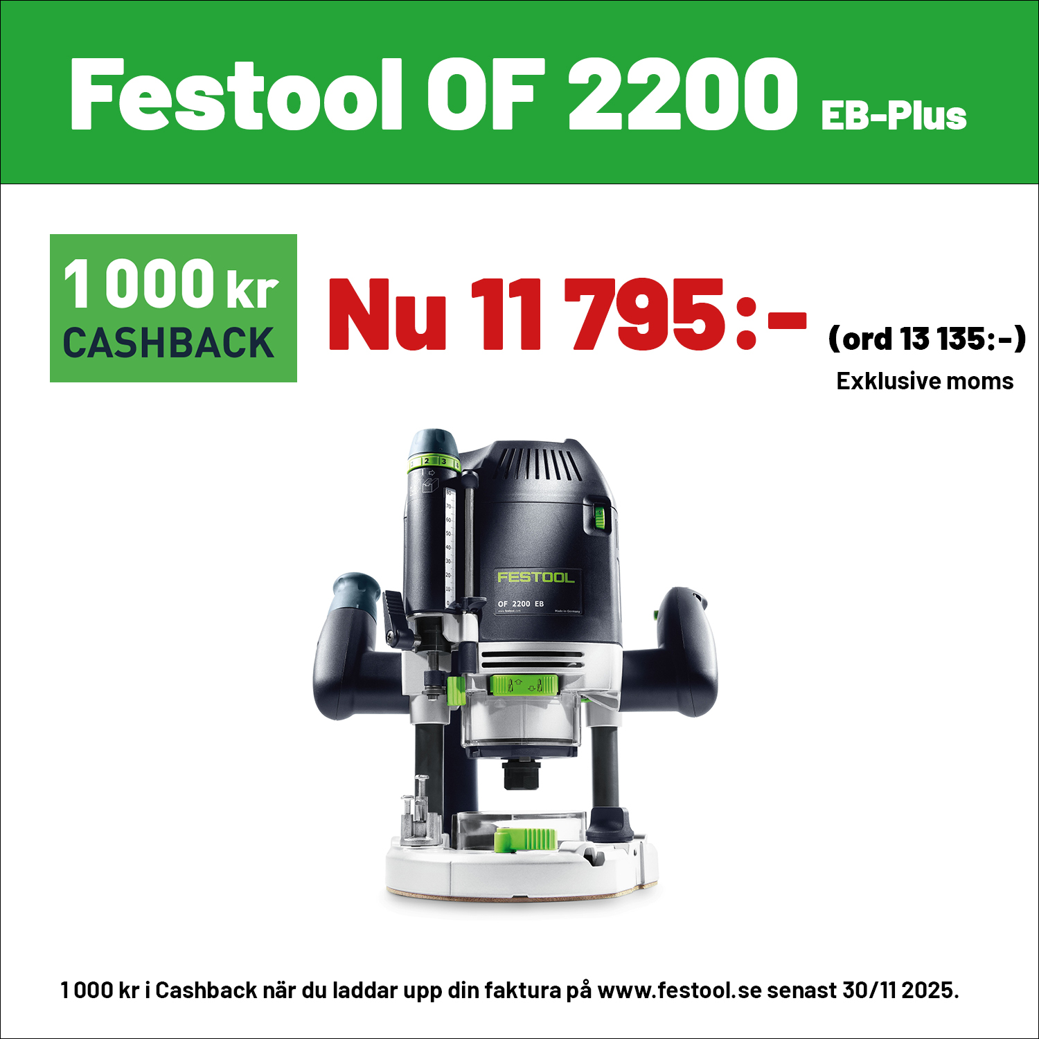 1 000 kr i Cashback vid köp RO 90, 125 eller 150 samt OF 1010, OF 1400 eller OF 2200 när du laddar upp din faktura på www.festool.se Gäller t om 30/11 2025. Gäller ej RO 150 100 Year.