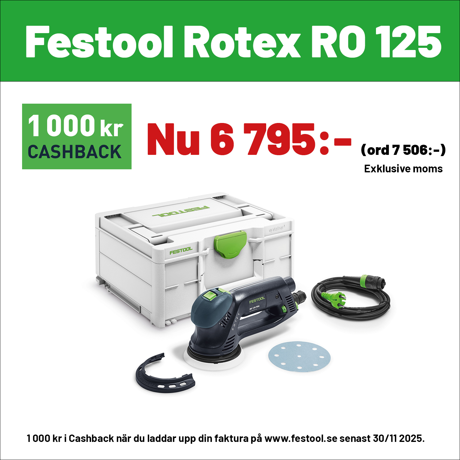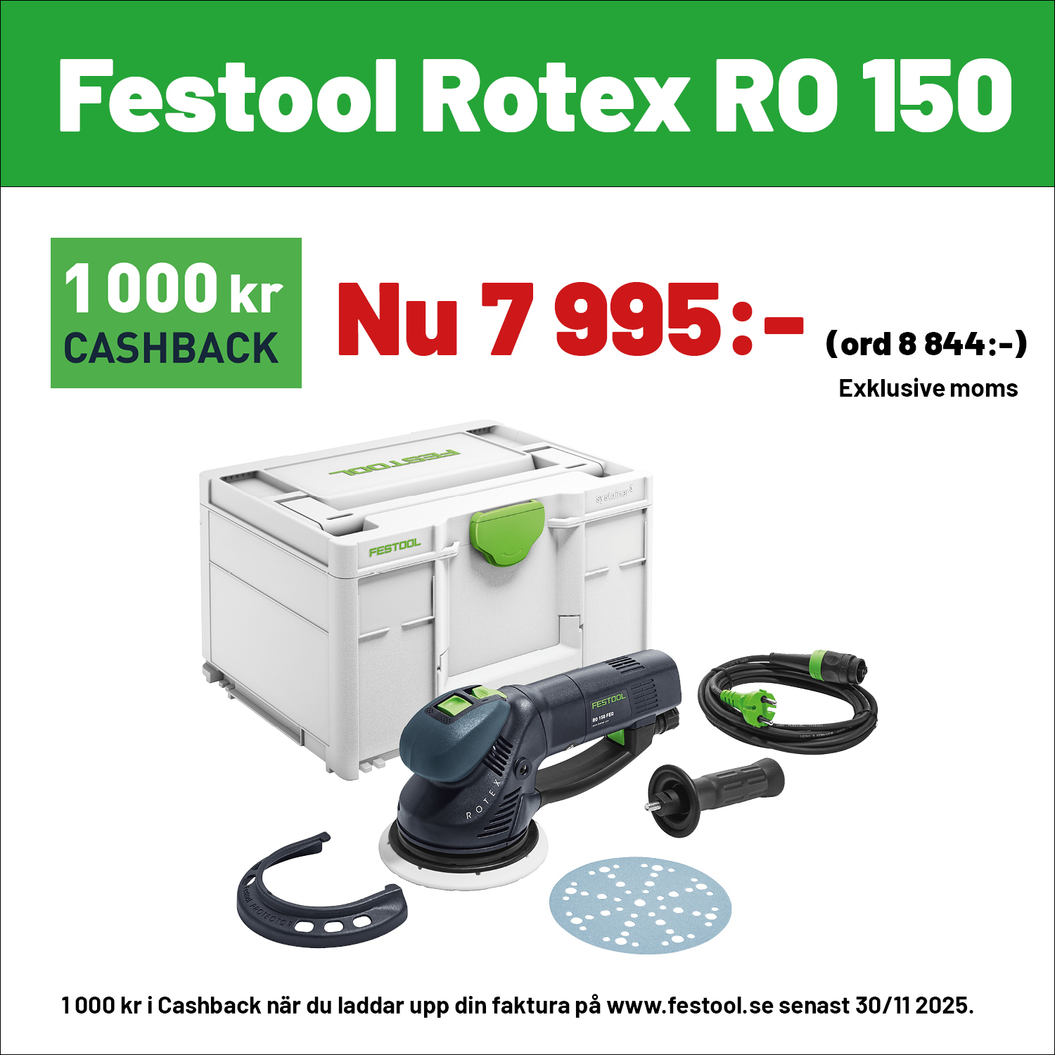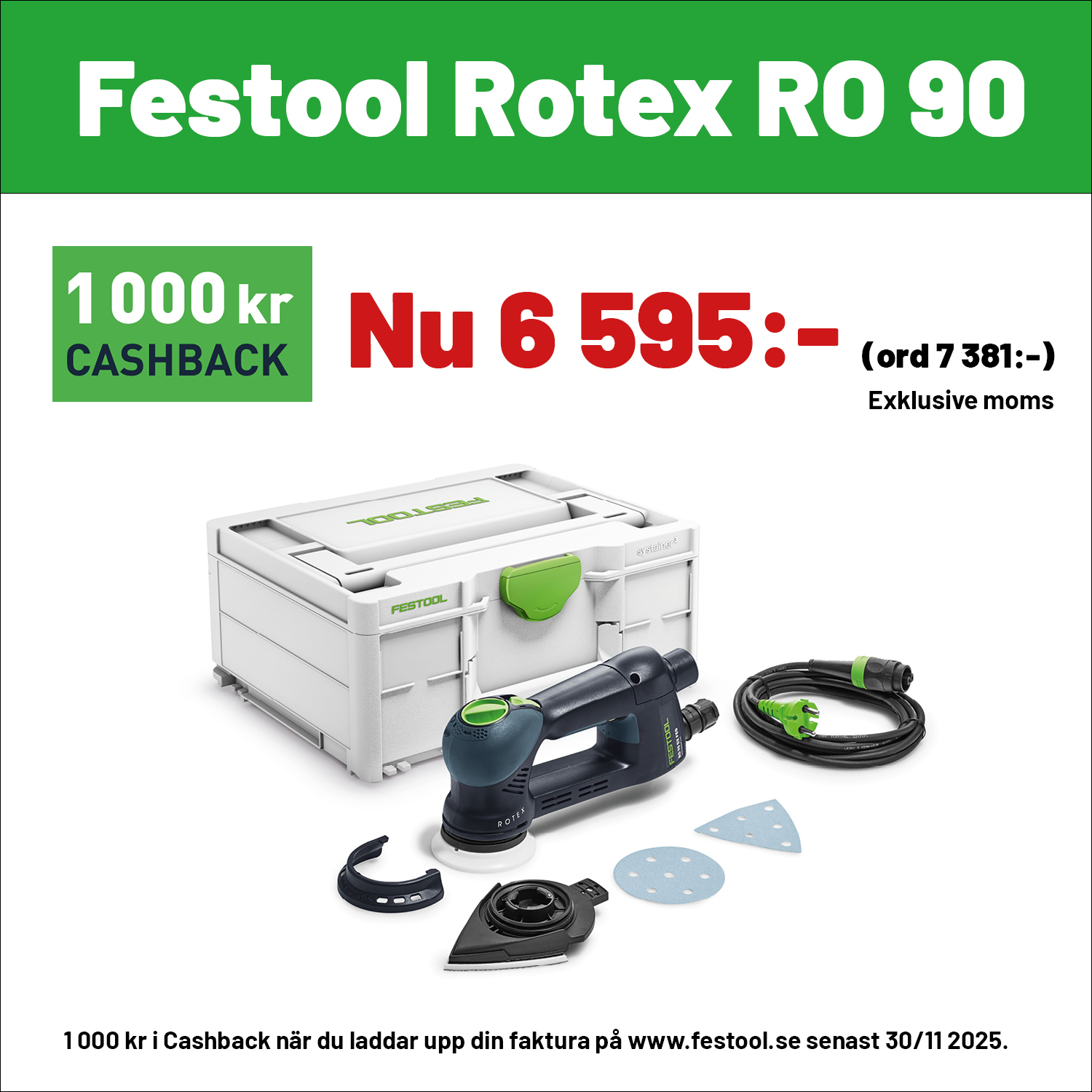 1 000 kr i Cashback vid köp RO 90, 125 eller 150 samt OF 1010, OF 1400 eller OF 2200 när du laddar upp din faktura på www.festool.se Gäller t om 30/11 2025. Gäller ej RO 150 100 Year.