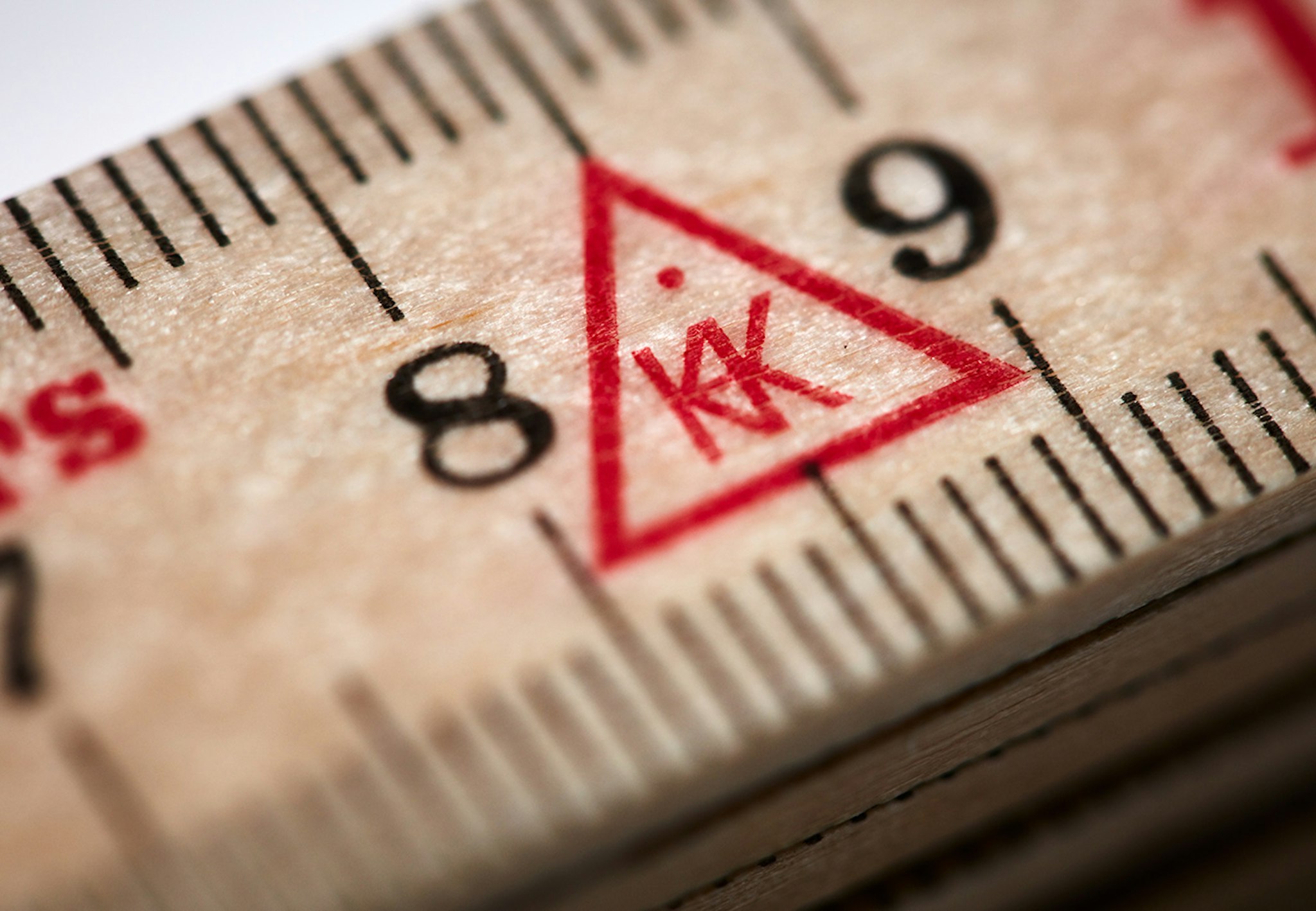 8,5 cm in på linjalen finns det en röd triangelsymbol med bokstäverna KHJK. Detta är inget hokus-pokus, utan helt enkelt Hultafors egen företagssymbol och är en förkortning för Karl-Hilmer Johansson Kollén.